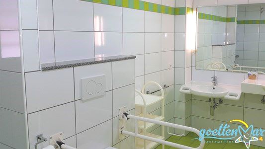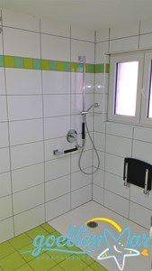 Befahren können Sie die Wohnung ebenerdig über die Terrasse. Das Bad ist so gebaut, dass Sie es mit dem Rollstuhl befahren können, ebenso die Dusche. Natürlich wurde auch an die Toilette gedacht. Ein Waschbecken ist etwas niedriger angebracht.